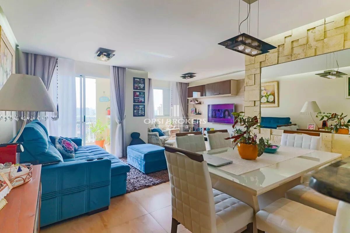 2 quartos (sendo 1 suíte com sacada), sala para 2 ambientes integrada com sacada gourmet envidraçada, cozinha em plano aberto, lavanderia e banheiro social.
